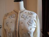 DescriptionCream coloured wool sweater; buttons up the front; white and silver beaded flowers and trim.