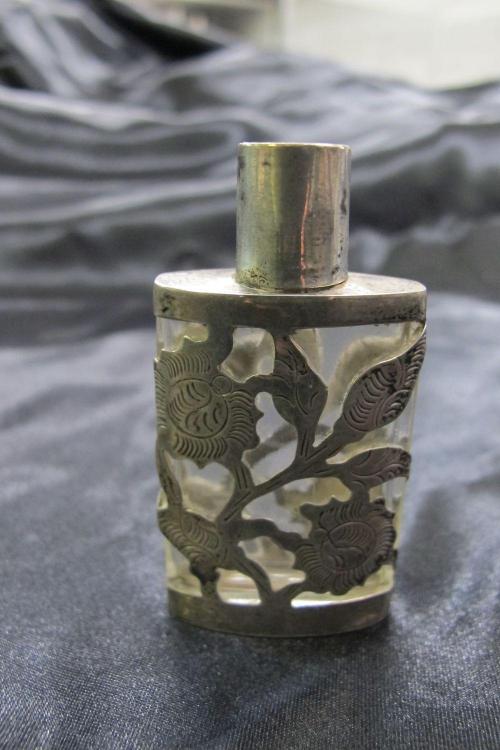 Glass perfume bottle with sterling silver overlay, silver screw top, overlay patter of leaves and florals, open-work engraving.