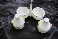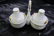 DescriptionCondiment set, consists of stand fitter with salt and pepper shakers, all pieces white with gold trim, salt and pepper raised pattern to resemble wicker covered wine bottles.