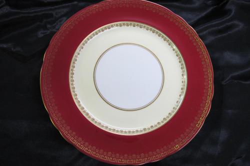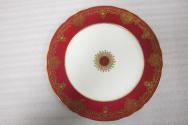 b: rim is burgundy colour decorated with gilt line on edge, inside the line, two further sections of gilt banding, geometric and spray pattern, well of plate decorated with gilt line & spray pattern, centre of well, two narrow gilt lines, centre of well is white with wide band ivory colour.