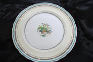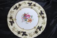 i: double indented rim has narrow gold line, rim of plate is ivory bordered with turquoise enamel band at outer part, inside this is black leaf decoration. interspersed with diamond & circle shapes in red or yellow enamel, inner narrow gold line, well of plate is white china decorated with basket of assorted flowers in enamel colours of turquoise and yellow with green leaves all surrounded by leaf stringing.