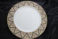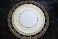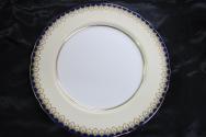 g: double indented rim, ivory colour, edged with narrow gold line, rim has cobalt blue scalloped pattern, scallops decorated with gold shield shaped pattern, inner part of ivory rim edged with two narrow gold lines, balance of plate white, undecorated.