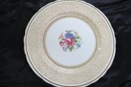e: double indented rim edged with gold line, narrow gold inner line, 4cm wide beige band decorated with all-over gold coloured lacy design, centre of well decorated with painted floral spray-one pink rose and rose bud surrounded by several other flowers & green leaves, this surrounded by narrow gold line & dagger edge.