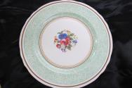 f: double indented rim edge with gilt band with inner line of gilt, with 4cm wide green band decoratedwith all over green lacy pattern, the centre of the well is decorated with floral painted spray with rose, rosebud and other flowers and leaves surrounded by gilt band & dagger edge.