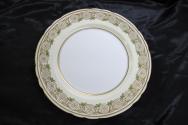 h: double indented ivory rim edged with gilt with inner band of gilt and gilt scroll & leaf repeated pattern with green grapes, white plate well has 2 outer gilt bands.