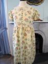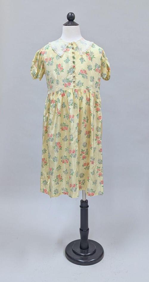 DescriptionYellow with blue and red flower print child's dress, skirt is full and gathered at bodice which is buttoned up the front to a lace collar, sleeves are short and puffed, on each side of the waist is a belt loop.