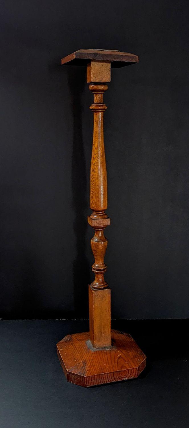 DescriptionWooden ashtray stand, Baluster, wood, metal thick octagonal base, lathe turned decorative work on the spindle and topped with square form with inlaid metal ashtray.