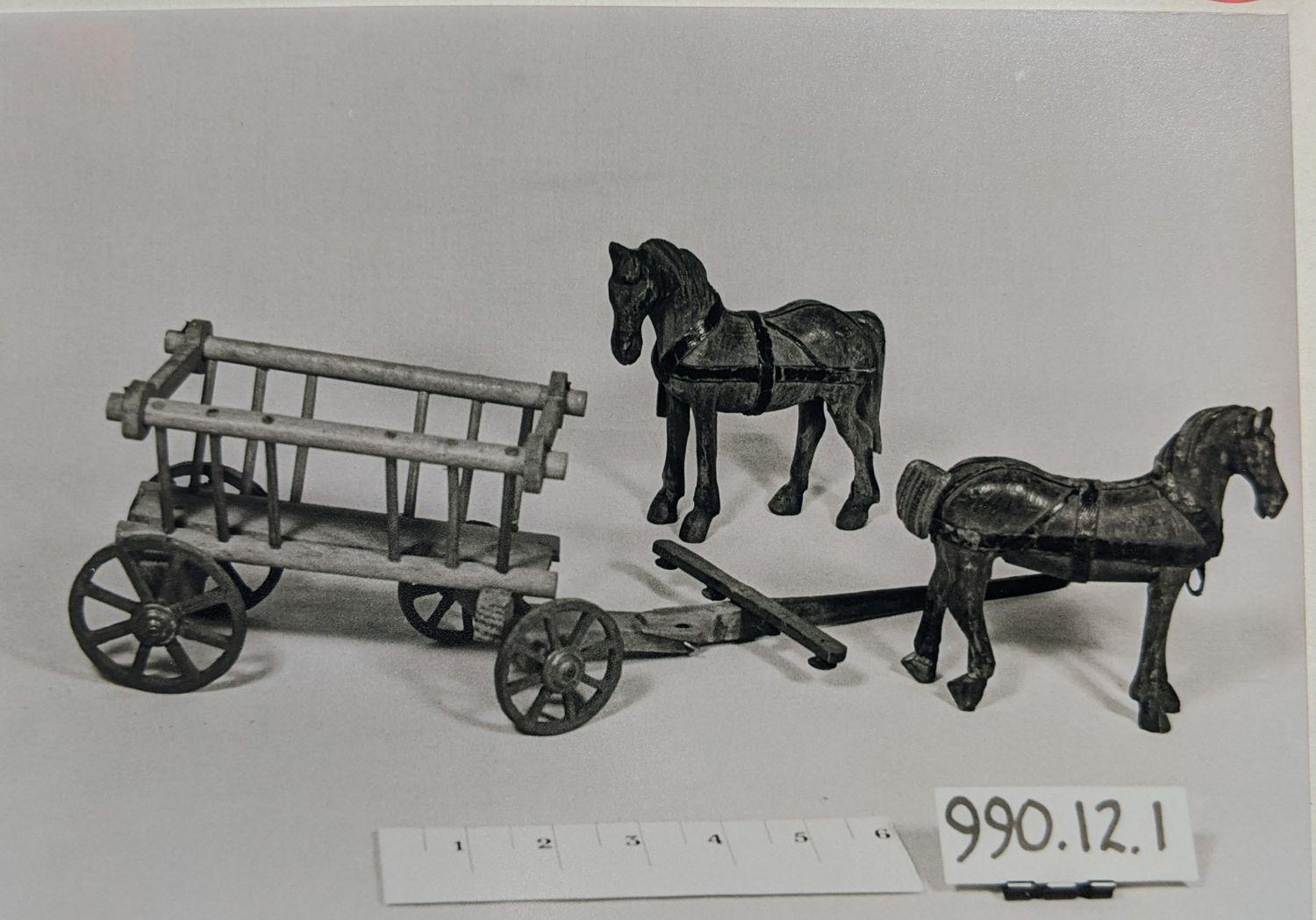 DescriptionToy farm wagon with 2 carved wooden horses, red spoke wheels, leather tack.
