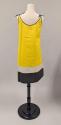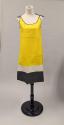 DescriptionWomen's A-line yellow coloured paper dress with wide black and white horizontal bands at hemiline; bound with black trim at neckline; black spaghetti strap ties at both shoulders.