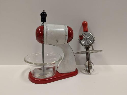 Toy kitchen accessories, electric mixing bowl and hand beater.