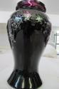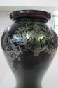 DescriptionFlower vase, black Tiffany "urn shaped" with ornate silver floral inlay and band near rim.