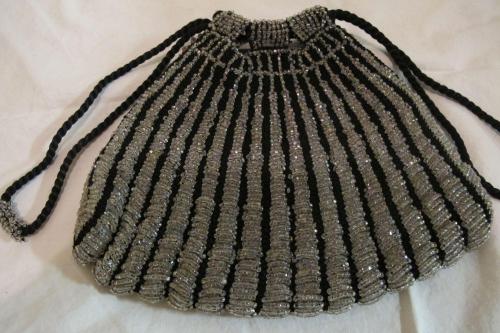 DescriptionBlack knit purse, vertical rows of clear beading, black cord drawstring.