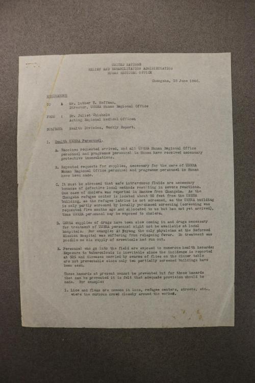 Four page memorandum; to Mr. Luther T. Hoffman from Dr. Juliet Chisholm; Health Division, Weekly Report; dated June 15, 1946.