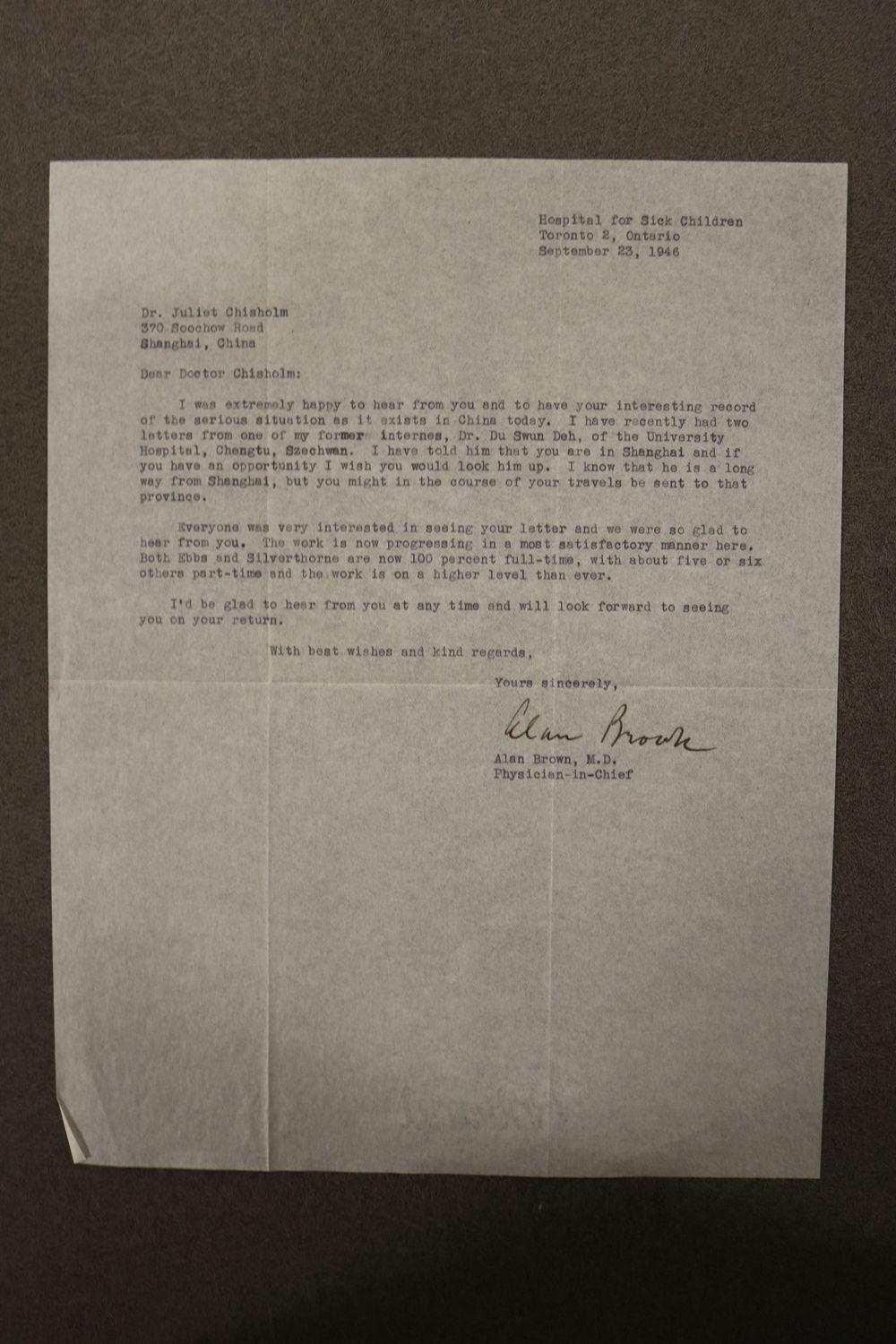 DescriptionLetter to Dr. Juliet Chisholm from Alan Brown, M.D., Physician-in-Chief at the Hospital for Sick Children; in response to a letter from Juliet about her work in China.