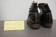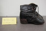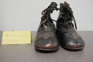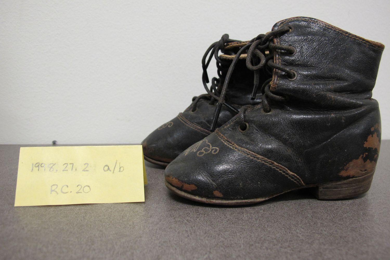 Lace-up boot style child's shoe, stitched floral design at ankle.